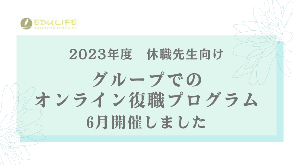 【実施報告】休職先生に向けたグループでのオンライン復職プログラム「EDUTIME」を開催しました今年度は「復職」という部分にもっとコミットしていこうと、新たな試み、グループでオンライン復職プログラム【EDUTIME】を6月に実施しました。病気休職中の教員を対象に、匿名性が確保された状態で、毎週月曜日と木曜日の朝8時30分~9時30分にZOOMに集い...
