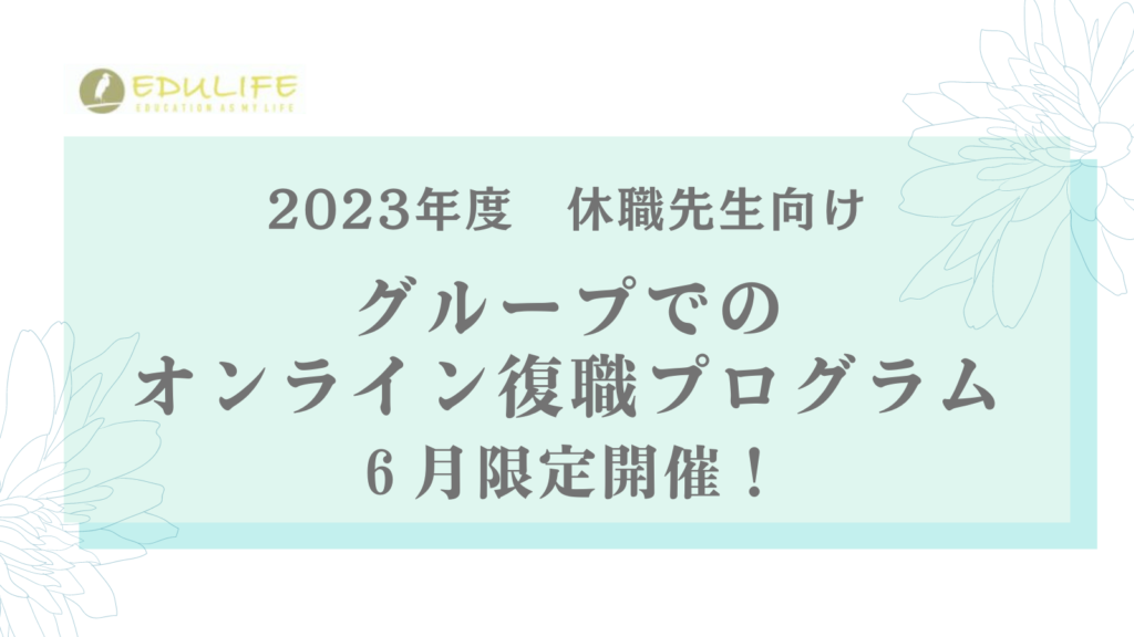 「休職して、あまりにもメリハリがない毎日に不安を感じている」「まだ外出は無理そうだが、家でできることで復職に向けたことができたら・・・」現在、EDULIFEでは、病気で休職中の先生への個別サポートを行っておりますが、上のような声もよく聞きます。... -